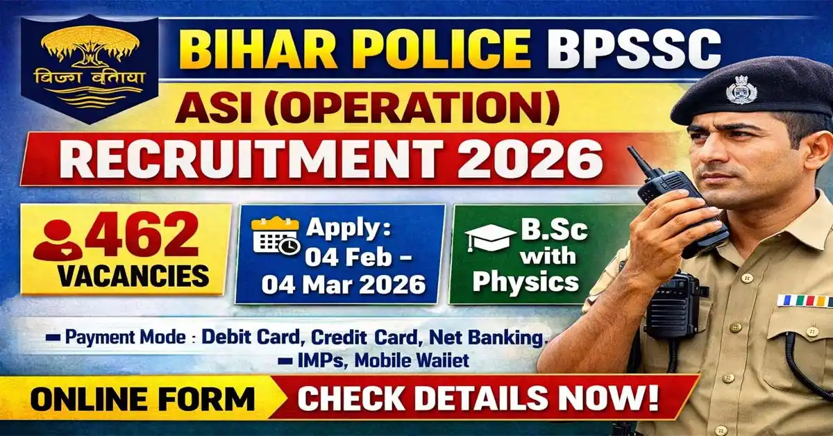 Bihar Police ASI Operation Recruitment 2026 :- The Bihar Police Subordinate Services Selection Commission (BPSSC) has invited online applications for 462 posts of Assistant Sub Inspector (ASI) (Operations) under advertisement number 04/2025. All interested and eligible candidates can fill out the form before the last date. Information on how to fill out the form is provided below.